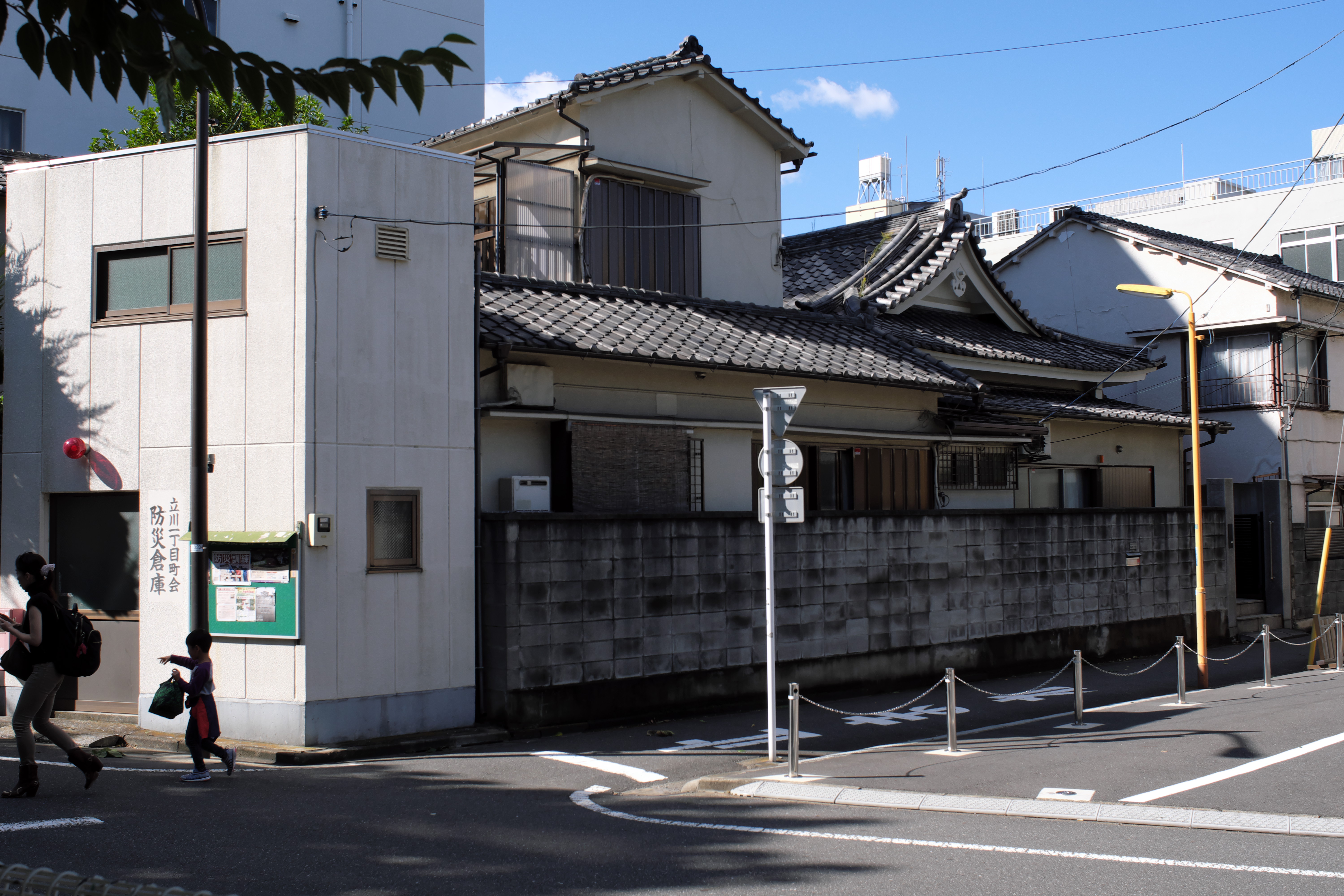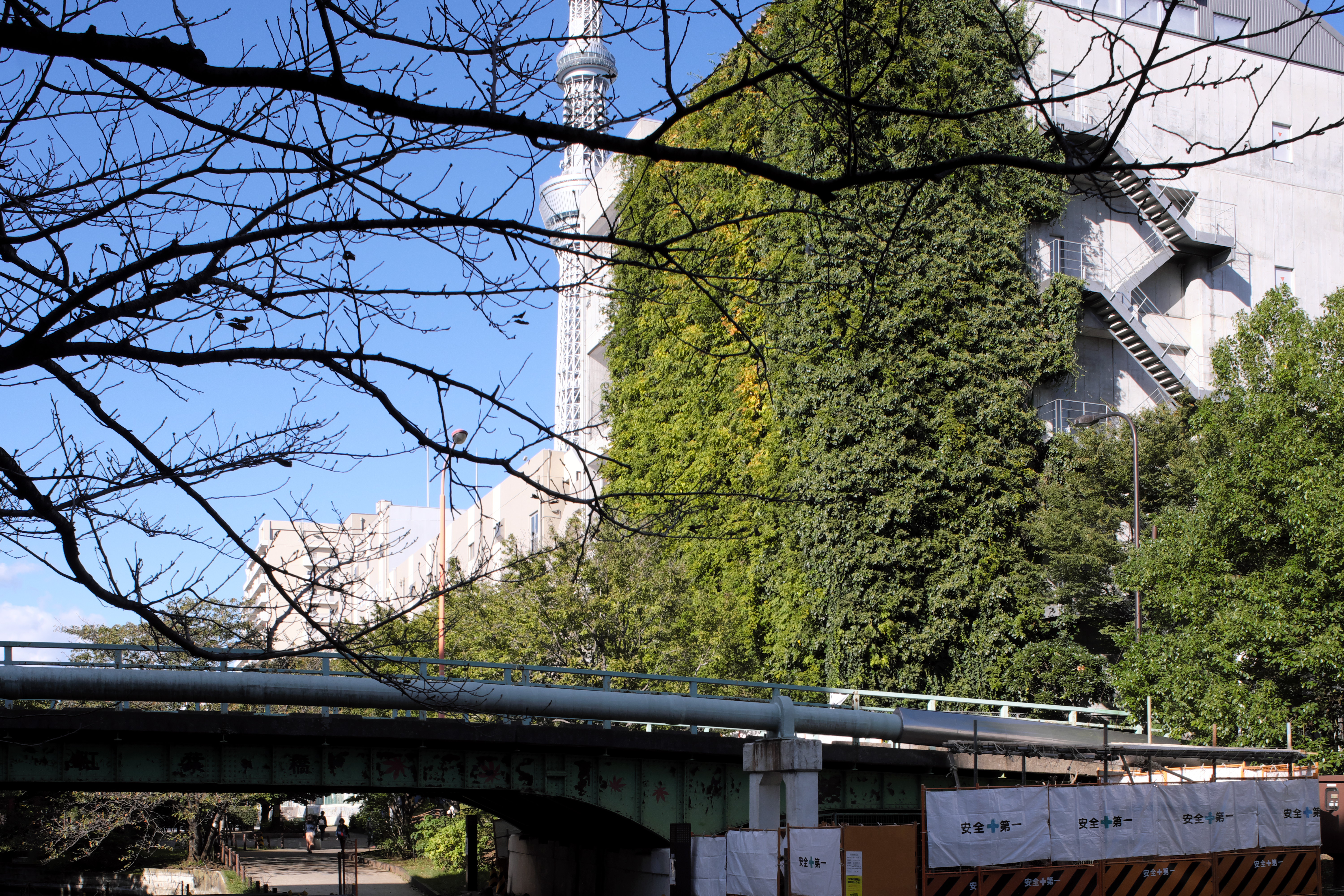 桜屋敷.現在は蔦の絡まる建物です.粋なはからいで,大横川の両岸に桜の樹が数本植えられているようです.見えている橋は紅葉橋(1930年竣工[6]).