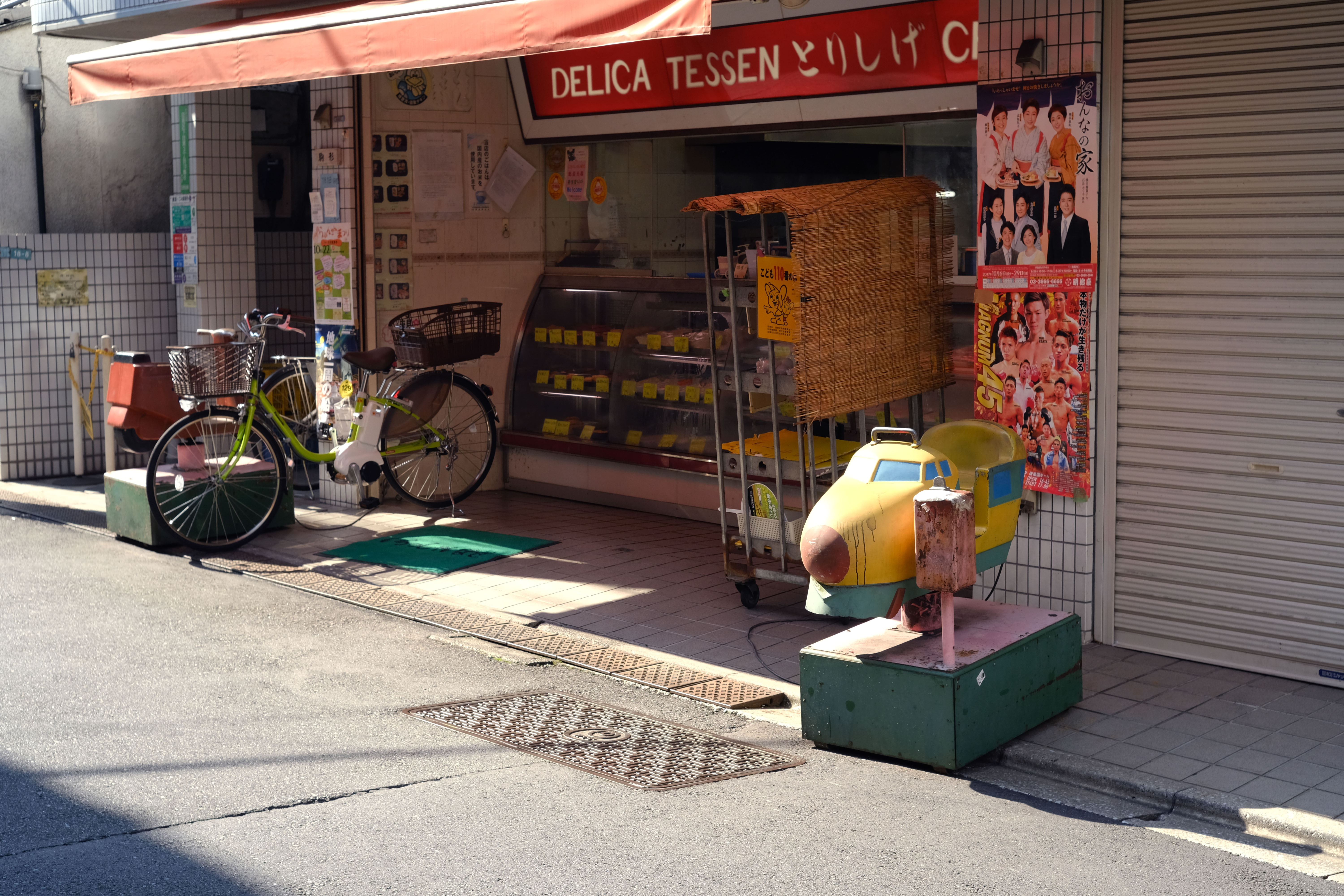 目黒不動尊参道の商店街.鬼平犯科帳にしばしば出てくる黒飴の桐屋は見つかりませんでしたが,代わりに昭和のオブジェを発見.