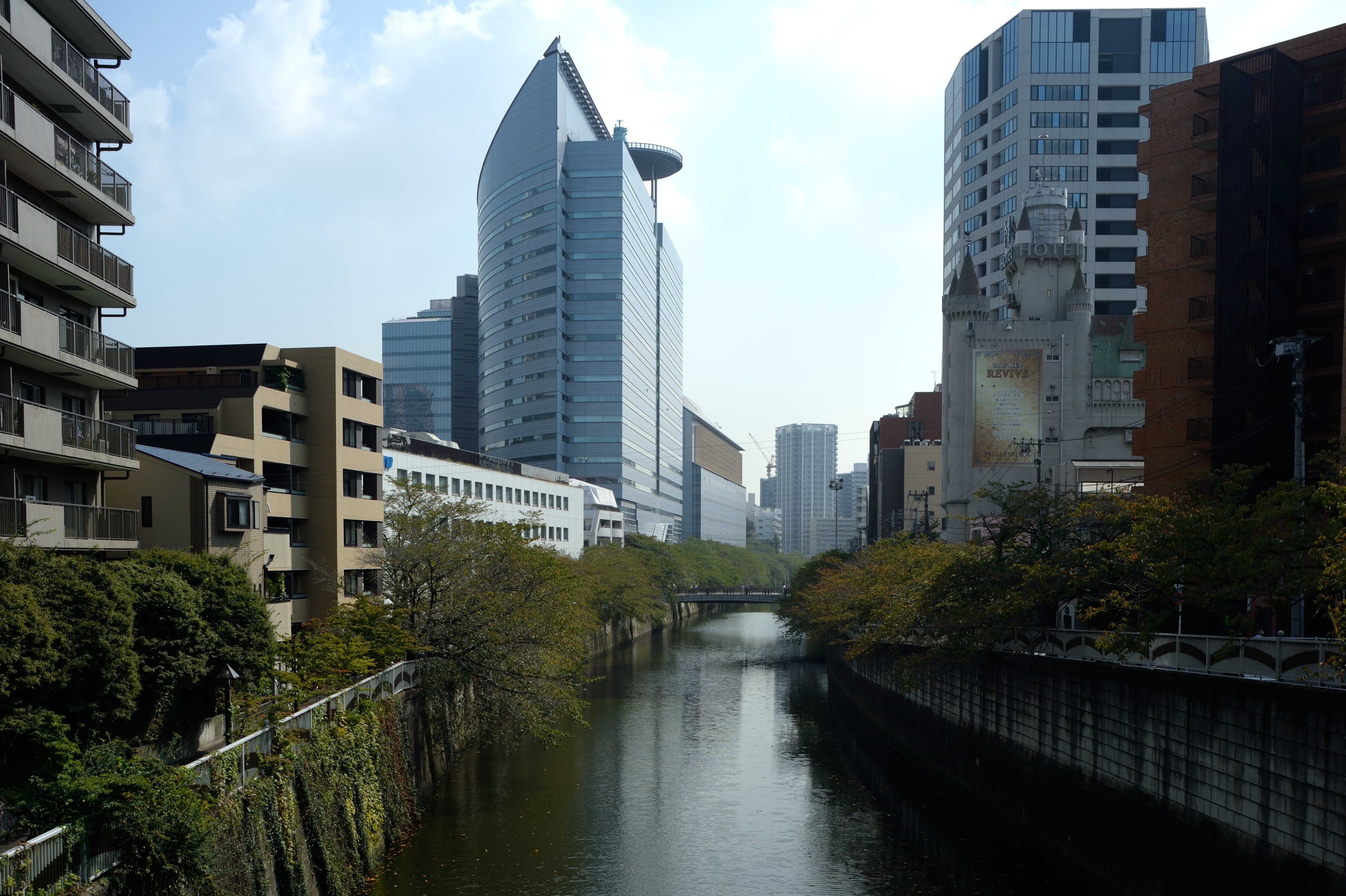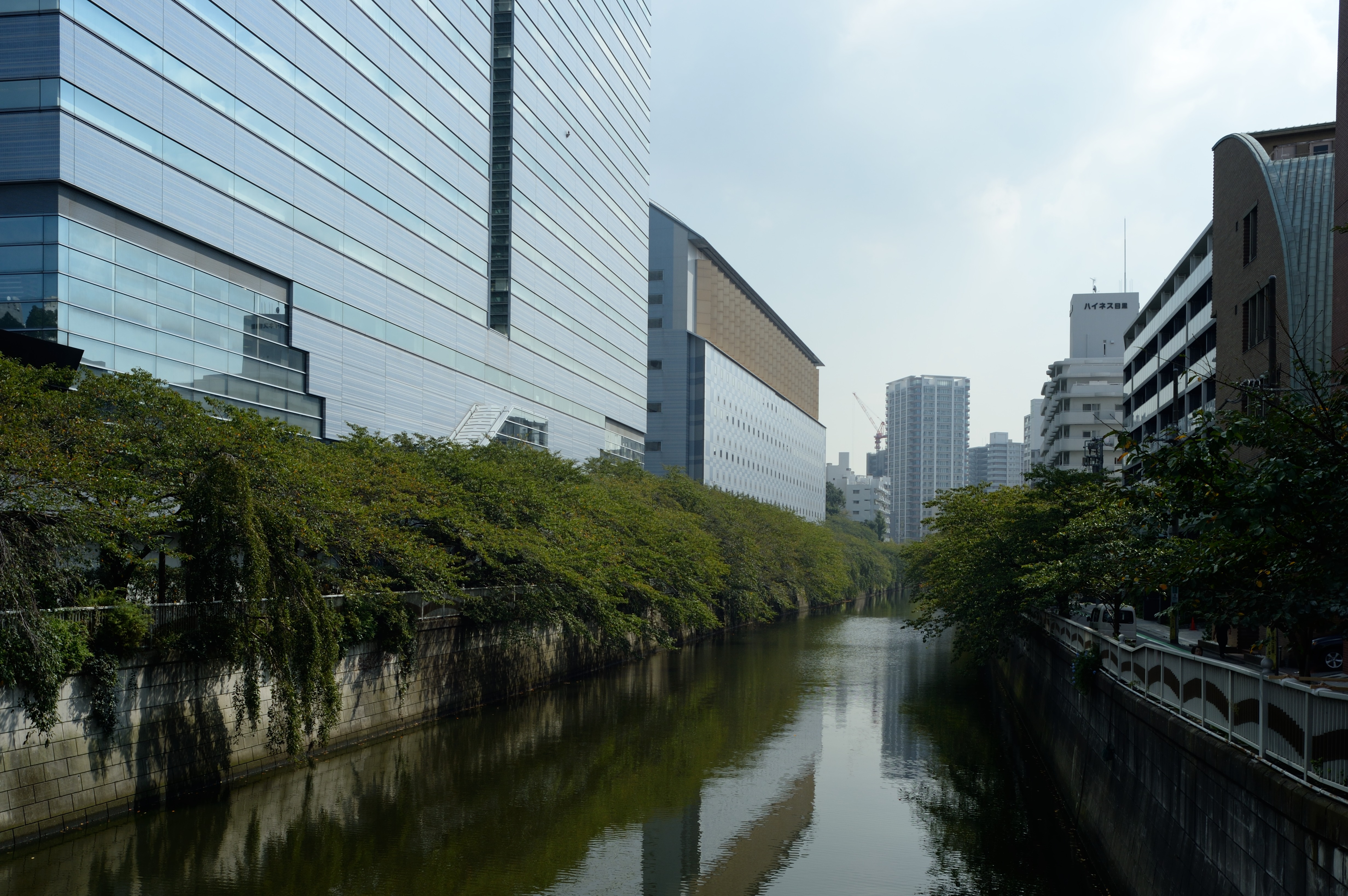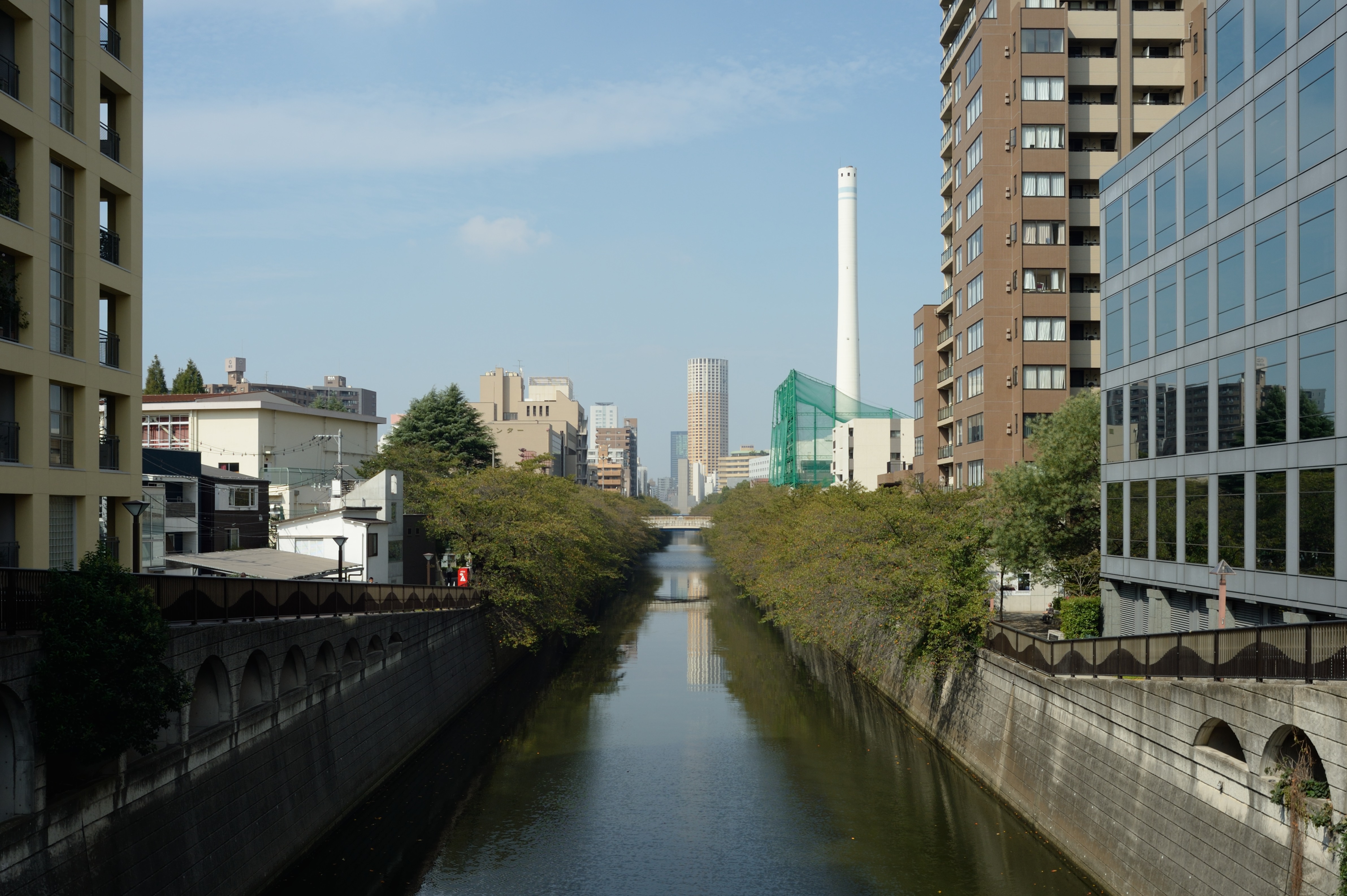目黒駅から権之助坂を下り目黒川にかかる目黒新橋から上流の渋谷方面を望む.