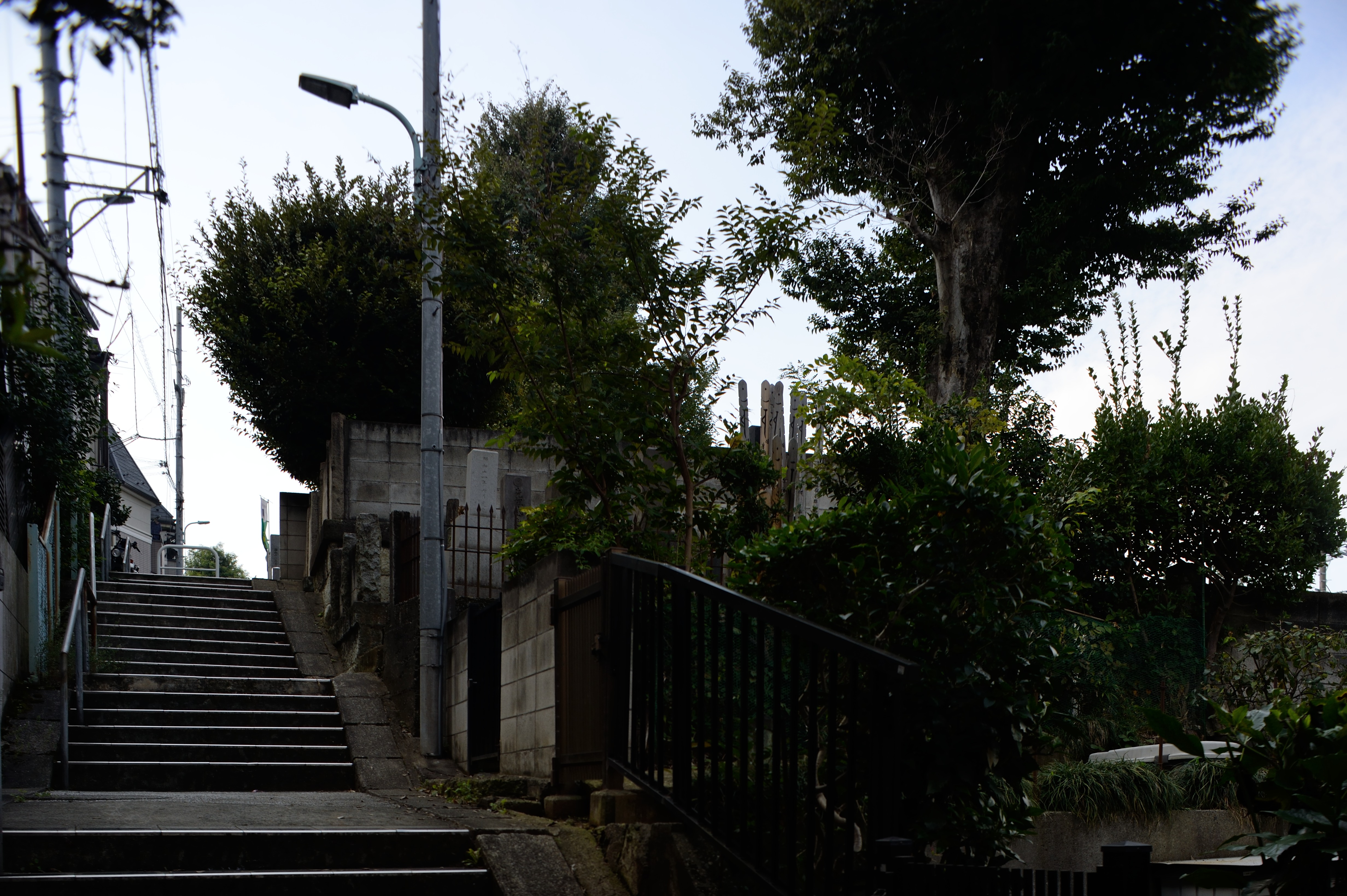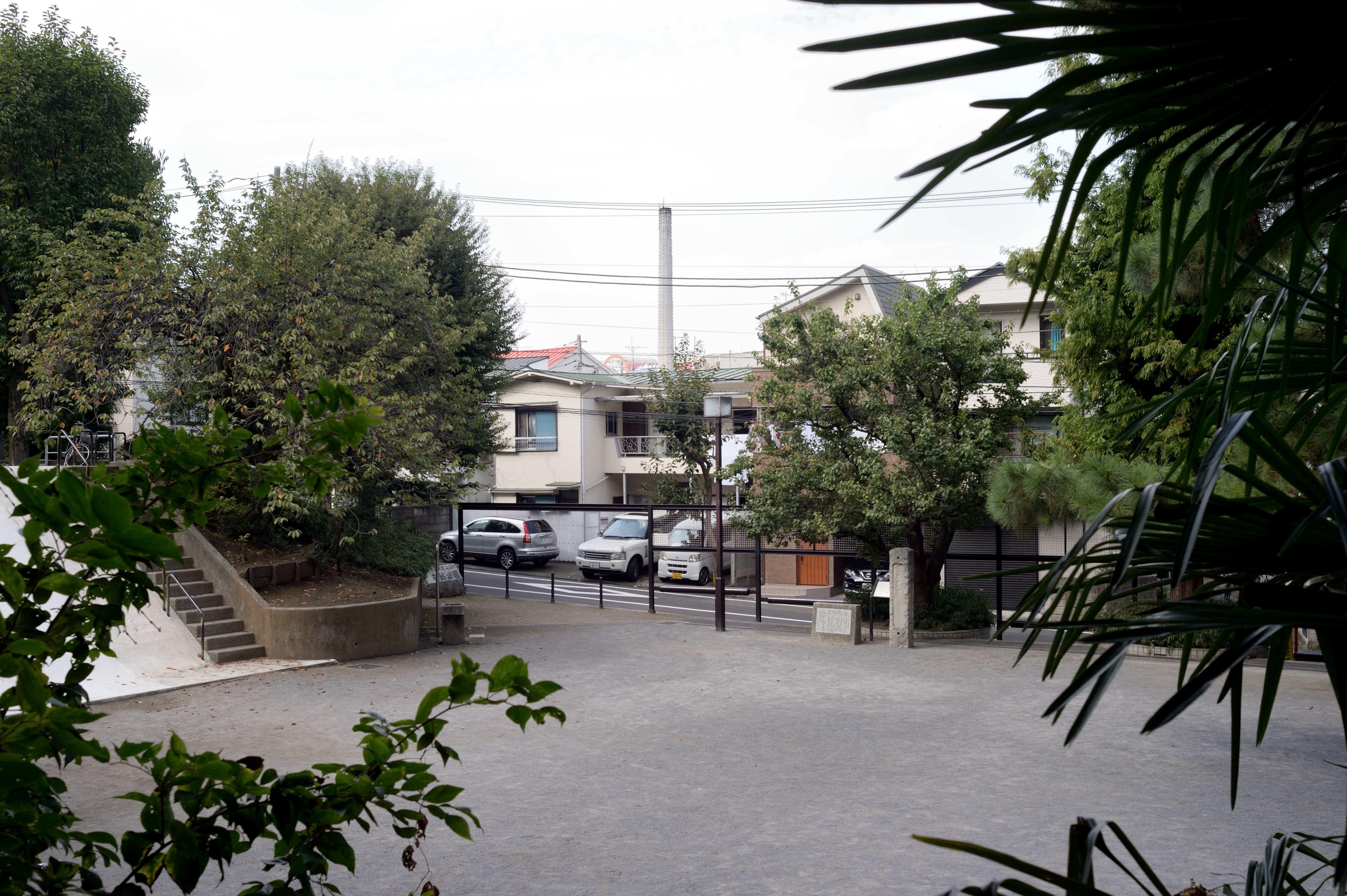 不動尊の北側に隣接する不動公園から銭湯の煙突を望む.