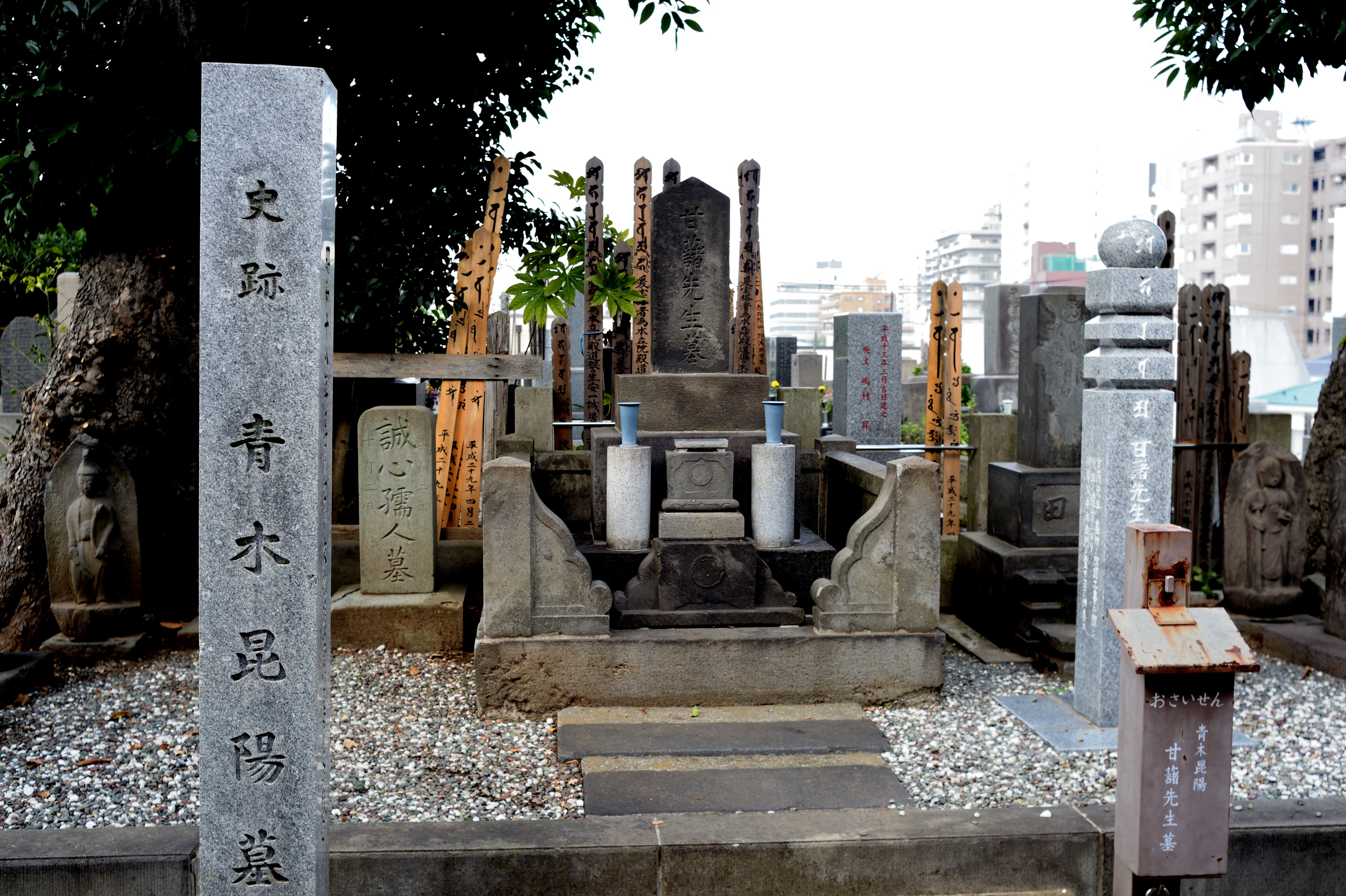 階段を上りきると,そこにあったのは江戸時代の儒学者の墓. 青木昆陽は,8代将軍吉宗公や,町奉行として有名な大岡忠相の下で活躍し,明和6年に亡くなったそうです[5]. 鬼平の時代には既にこの場所に墓があった筈です.