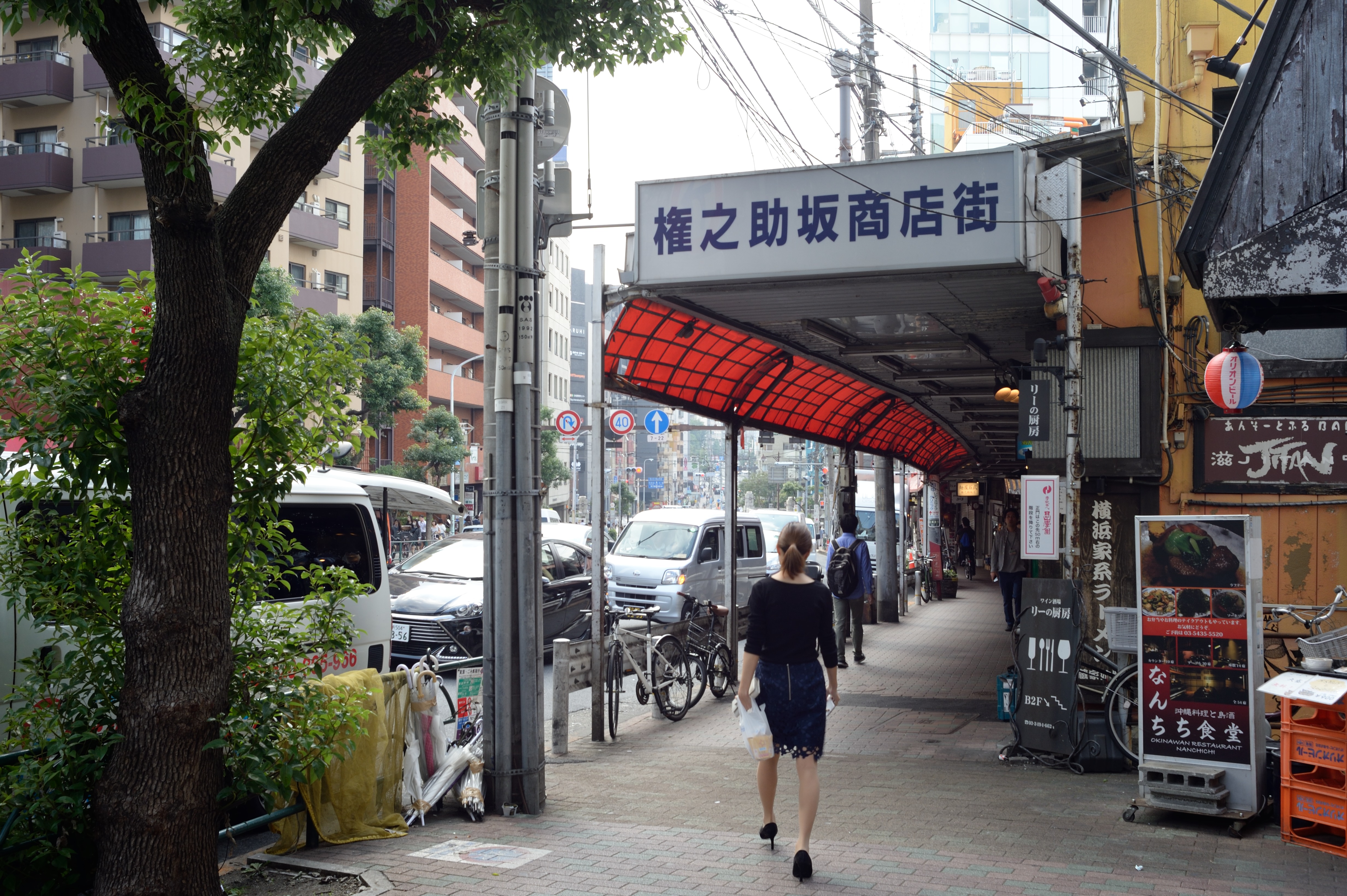 小さな飲食店が立ち並ぶ権之助坂. 鬼平犯科帳「俄か雨」では細川峯太郎が権之助坂の茶屋の女と恋仲であったことからストリーが展開します.