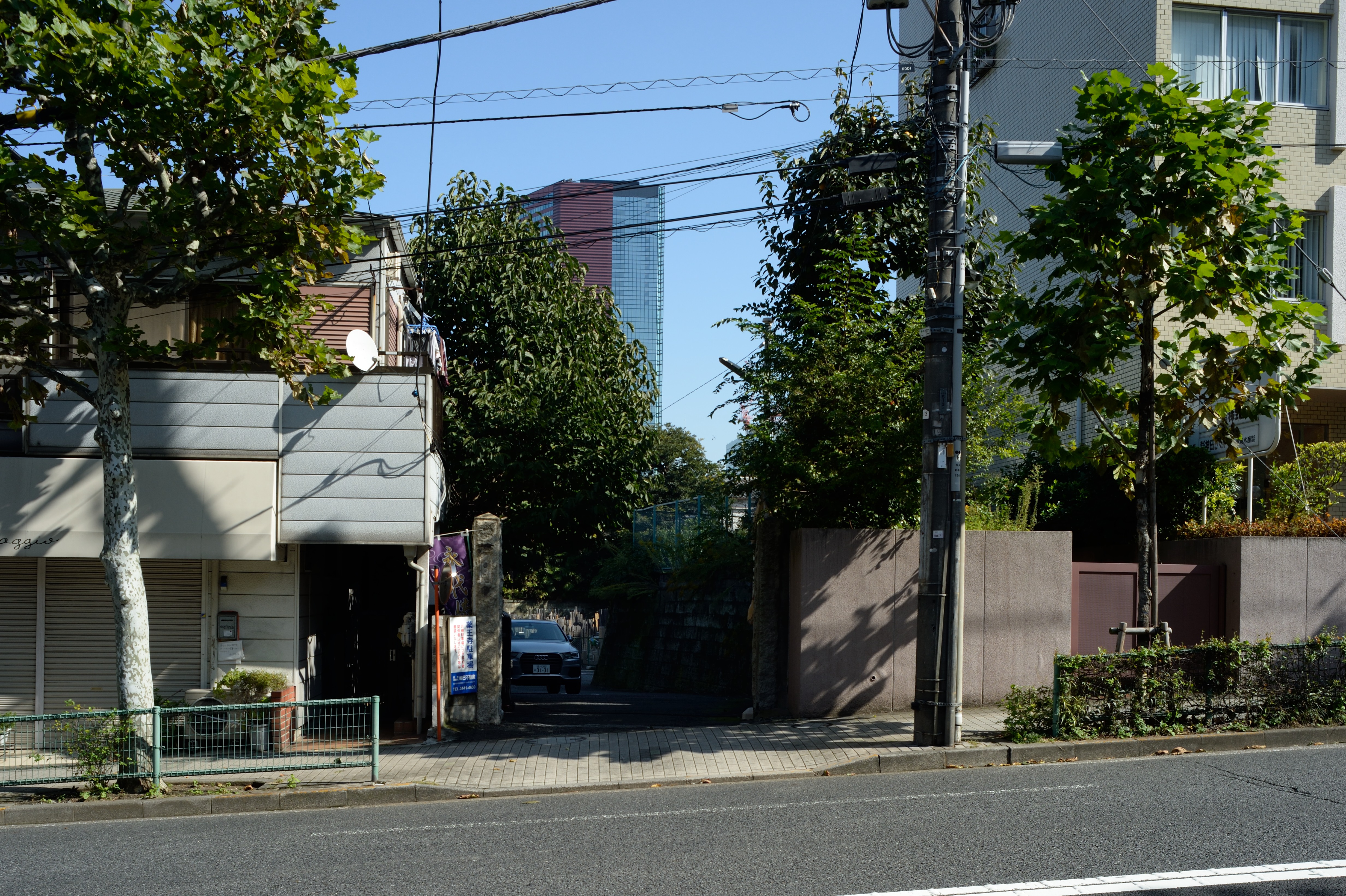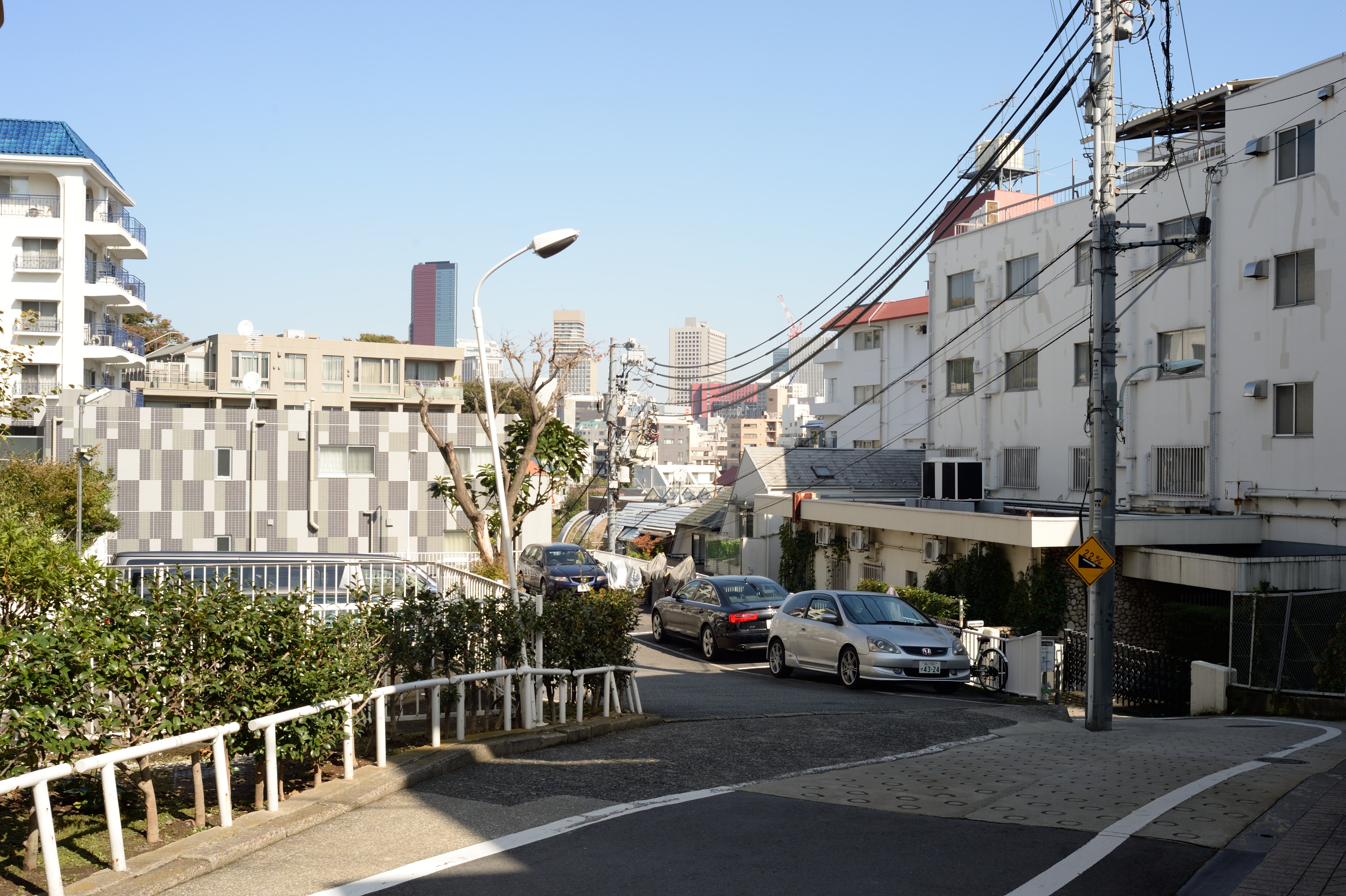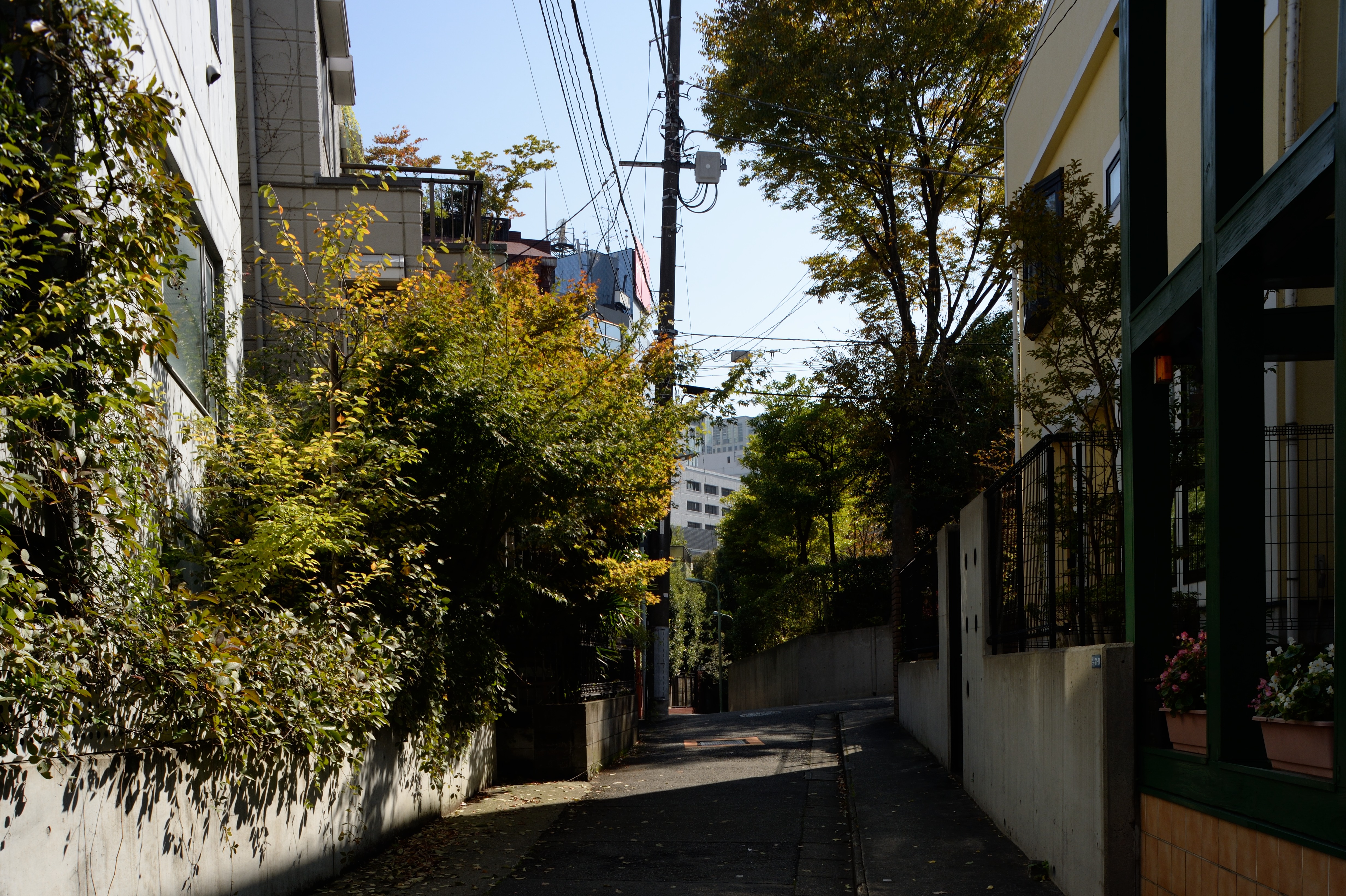 坂の途中で左に折れて高輪公園を抜けた先にある細道.散歩気分をかきたててくれます.