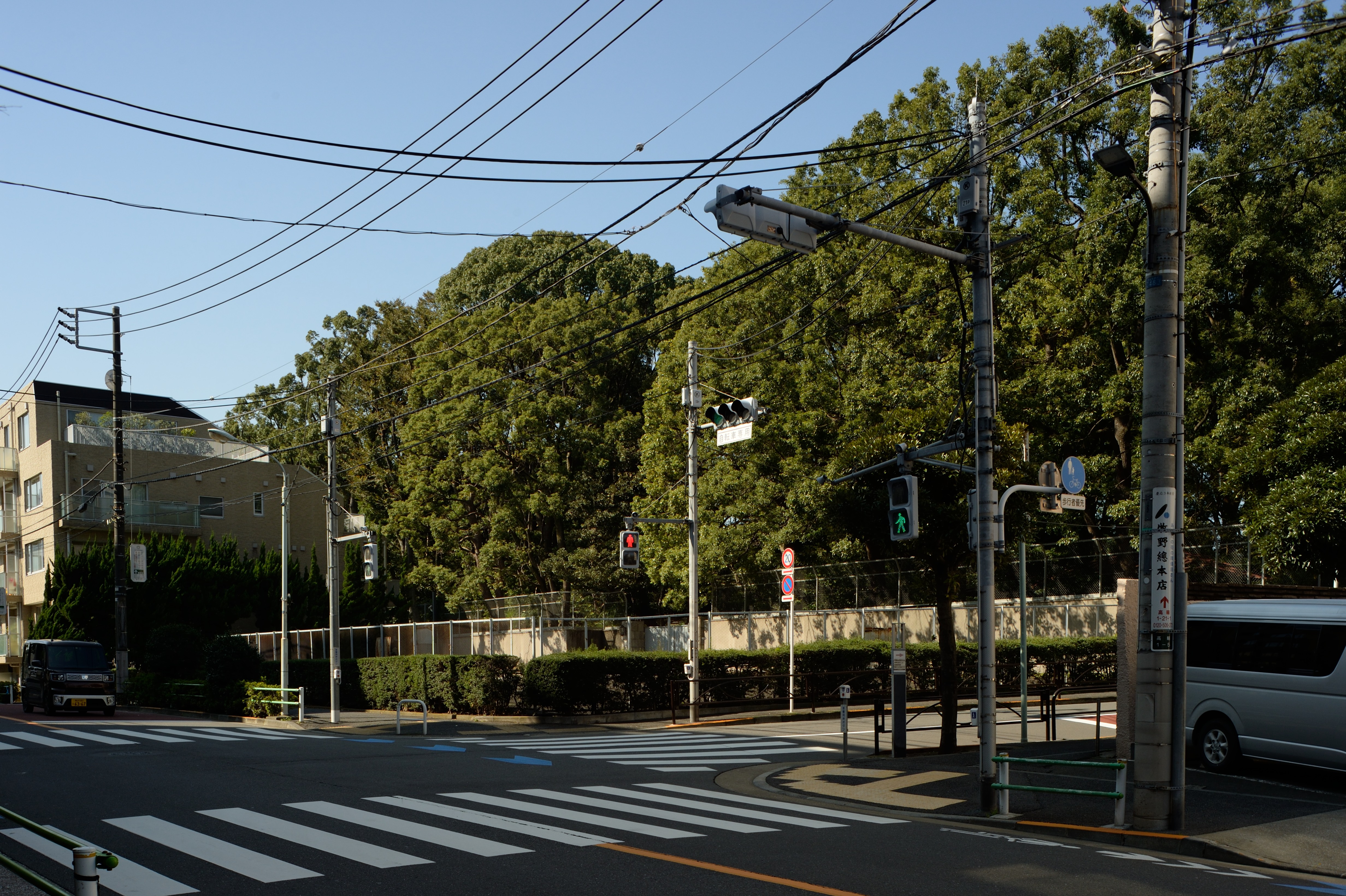 伊皿子の交差点まで坂を上り詰め,右折して高輪二本榎通りを進みます. 鬼平犯科帳「本門寺暮雪」は,平蔵が,親しい知人で高輪二本榎の屋敷に住む細井彦右衛門を訪問するシーンから始まります. 先ず右手に見えるのは高輪皇族邸の木々.
