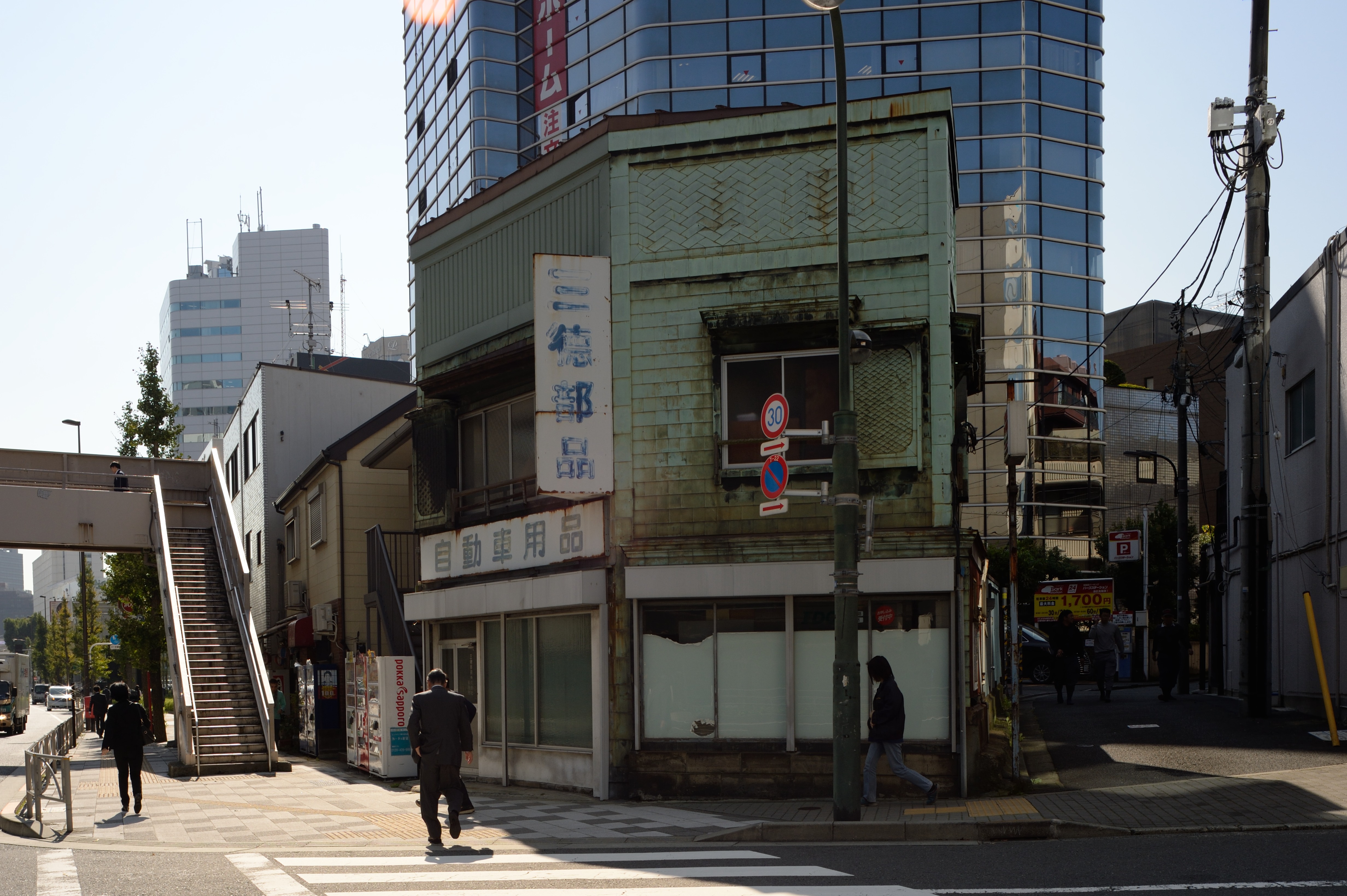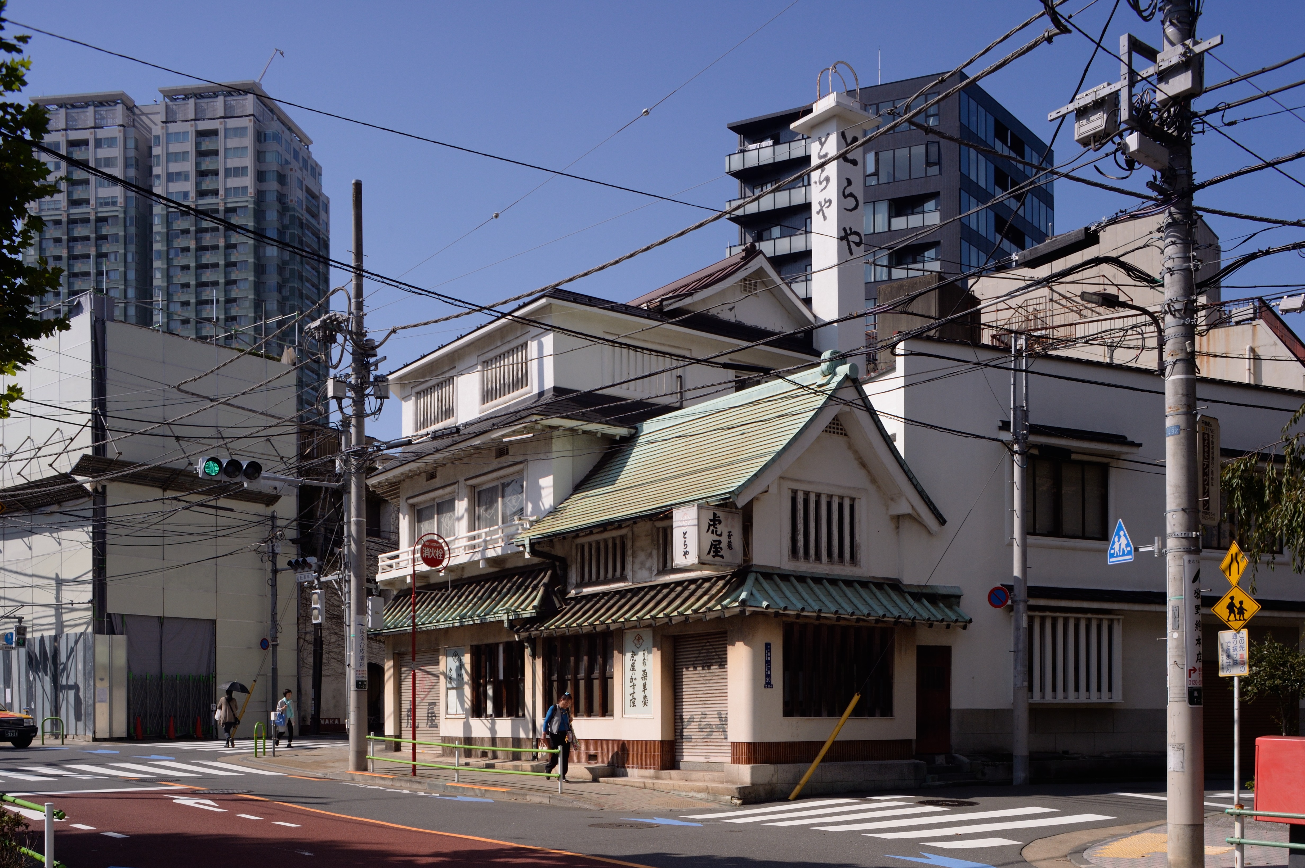 散歩の途上で看板建築を見つけるとついシャッターボタンを押してしまいます. 本稿を書く段になってのにわか勉強なのですが,1950年の建築基準法以降,銅板張りの看板建築は建てることができなくなった[16]ということですから,銅板張り看板建築を見つけたら1950年以前のものと見てよい,と理解しています.