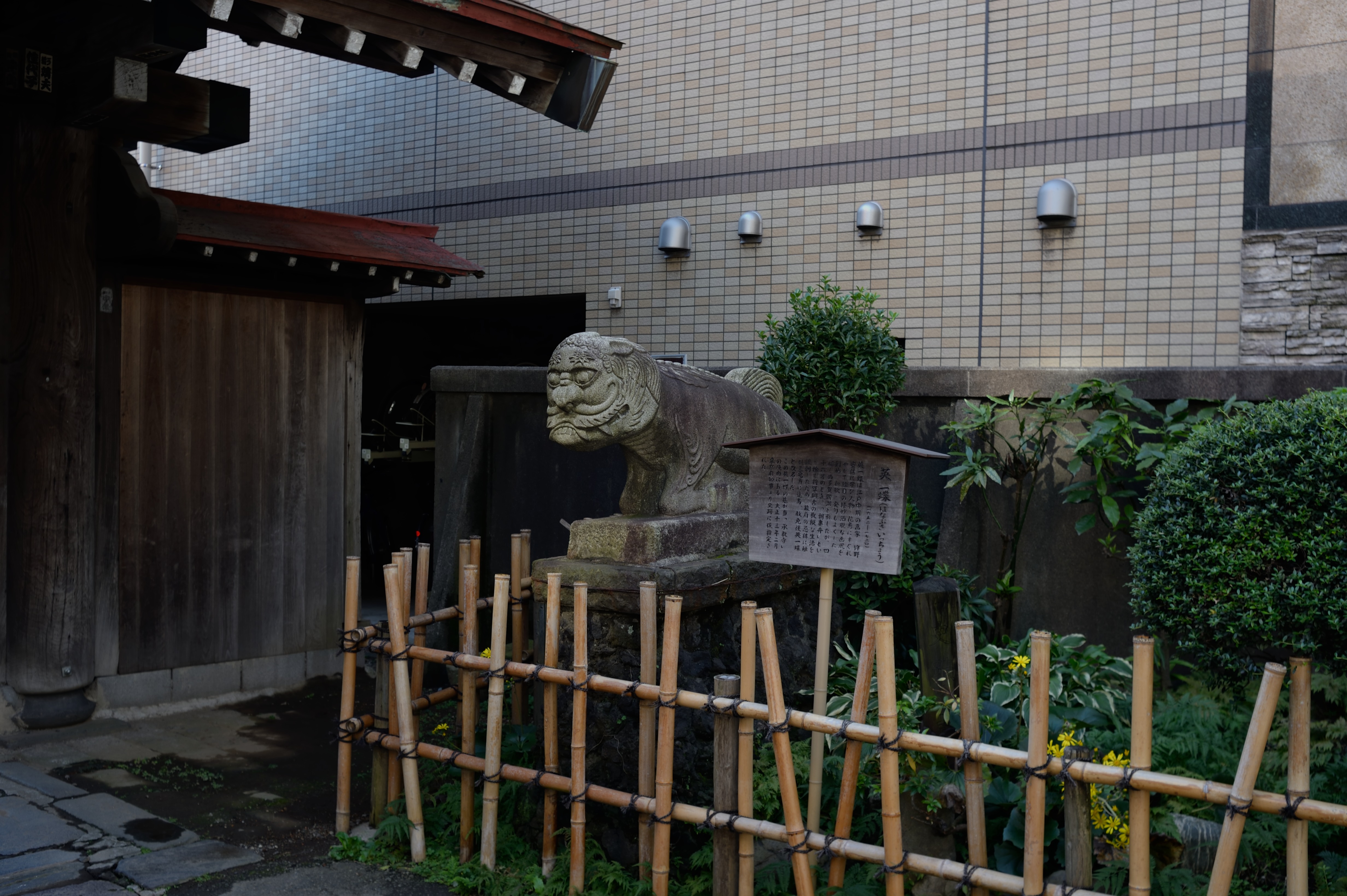 上の写真の立て札にありますが,この寺に画家の英一蝶(1652-1724年)の墓があるそうです.「件」は狛犬みたいに左と右で対になっています.
