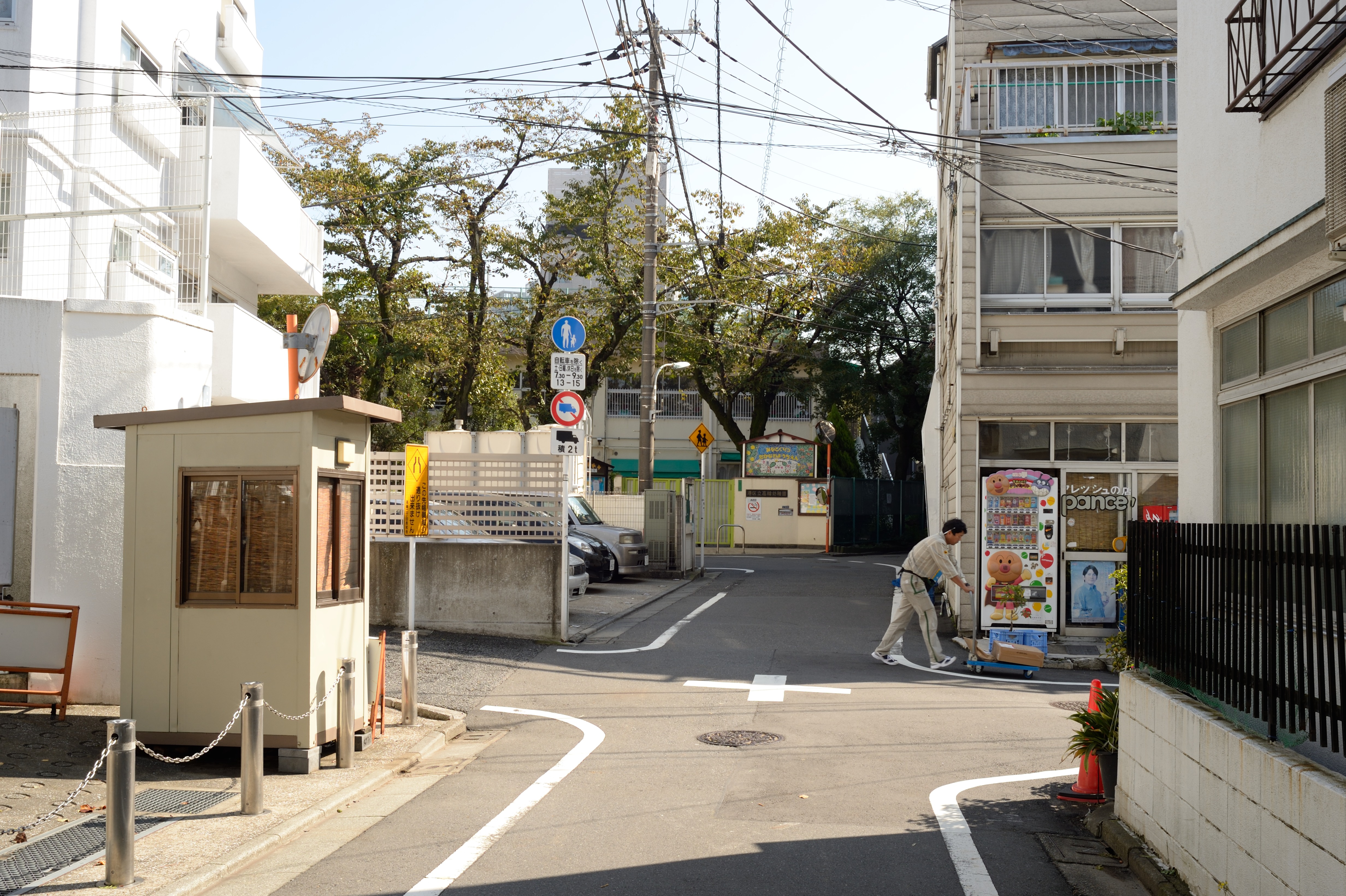 急に迷路っぽくなりました.江戸時代の地図[13]では一本道が突き当たって右へ折れているだけなので,平蔵の指示した道筋としてはここを右に入るのですが,前方に散歩気分をそそられる細道が見えるのでまっすぐ進みます.