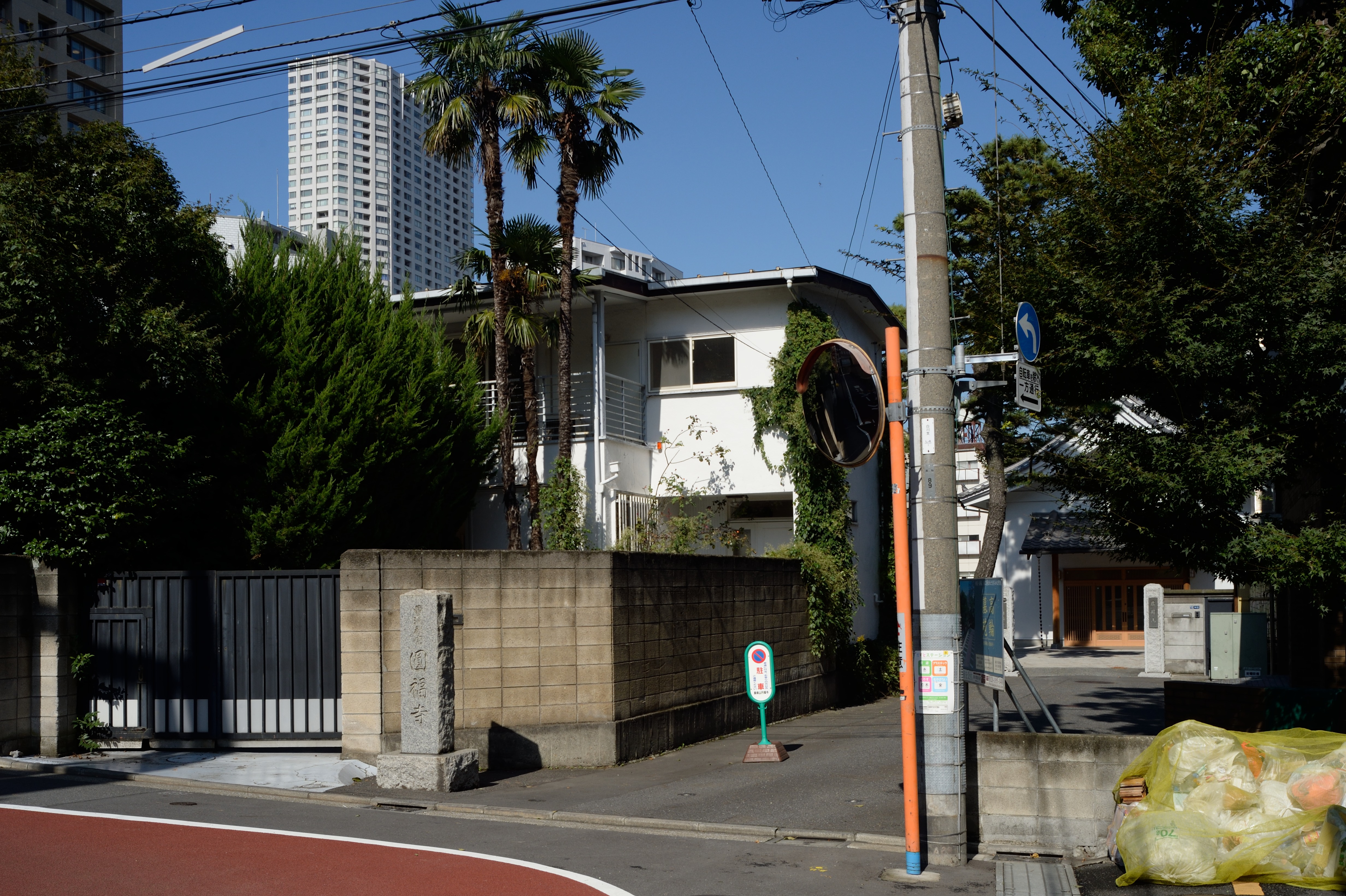 さて「本門寺暮雪」で,平蔵は,録之助に指示したのとは別の道を辿り東海道へ出ます. 小説の記述と合致する寺の名前は見つからないのですが,それとおぼしき道筋を辿ります. 光福寺の角を左へ入り,折れ曲がる道の途中にある円福寺入り口の風景.洒脱な住宅と寺と高層マンションが混在する地区です.